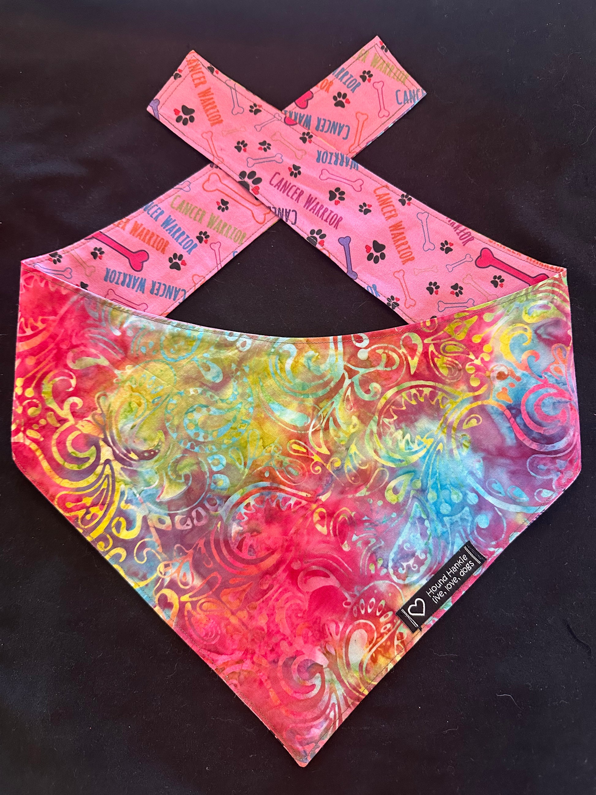With upu by his/her side your pup is a Cancer Warrior! Available in pink and blue; the flipside is a rainbow batik because we always have hope!