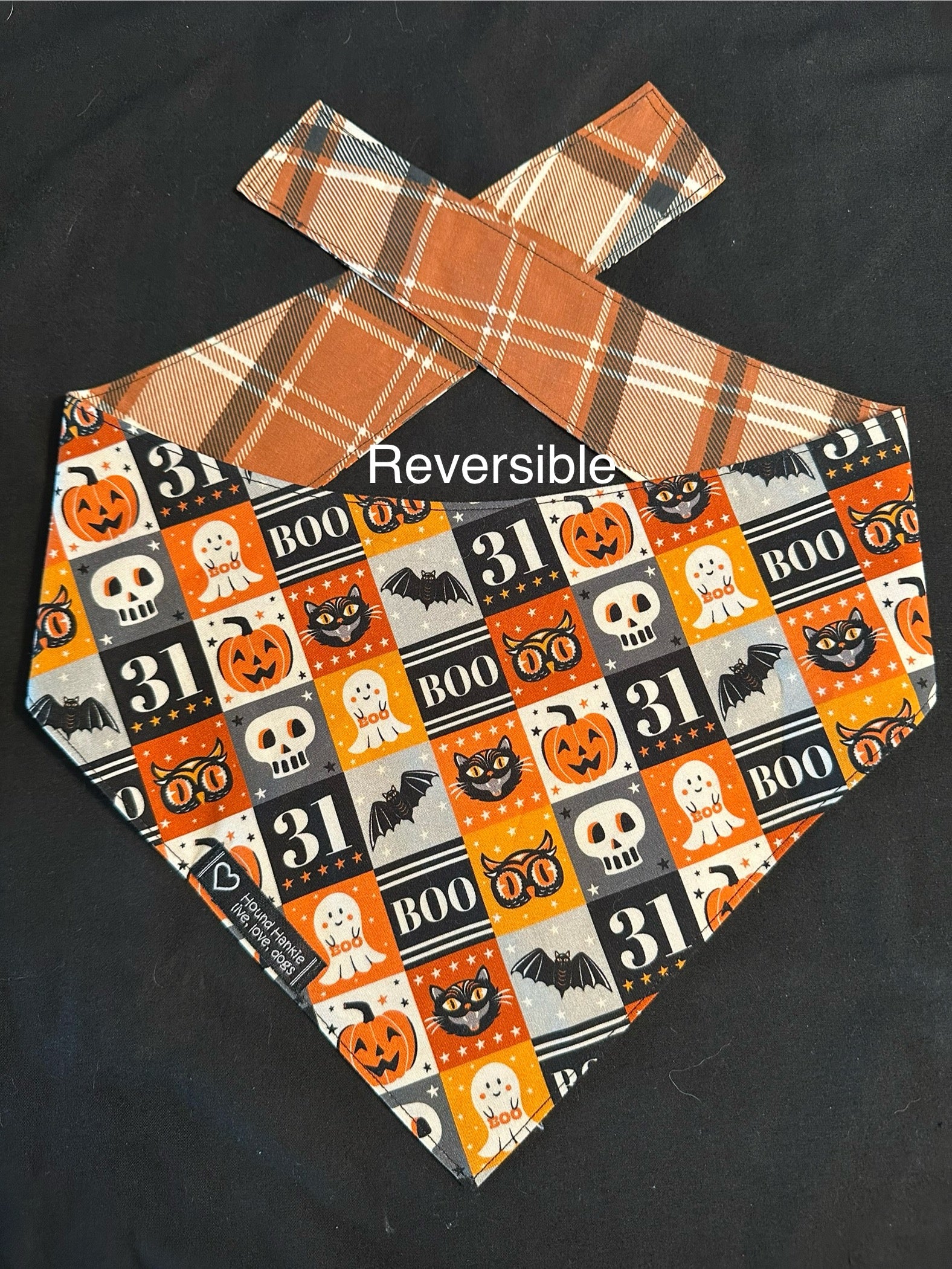 Fun block design for spooky season & a autumnal plaid on the flip side; reversible means more bark for your buck! Top stitching increases durability and creates a polished finished edge. A curved neckline makes the Hankie more comfortable (no bunching up of fabric); the labels are woven.