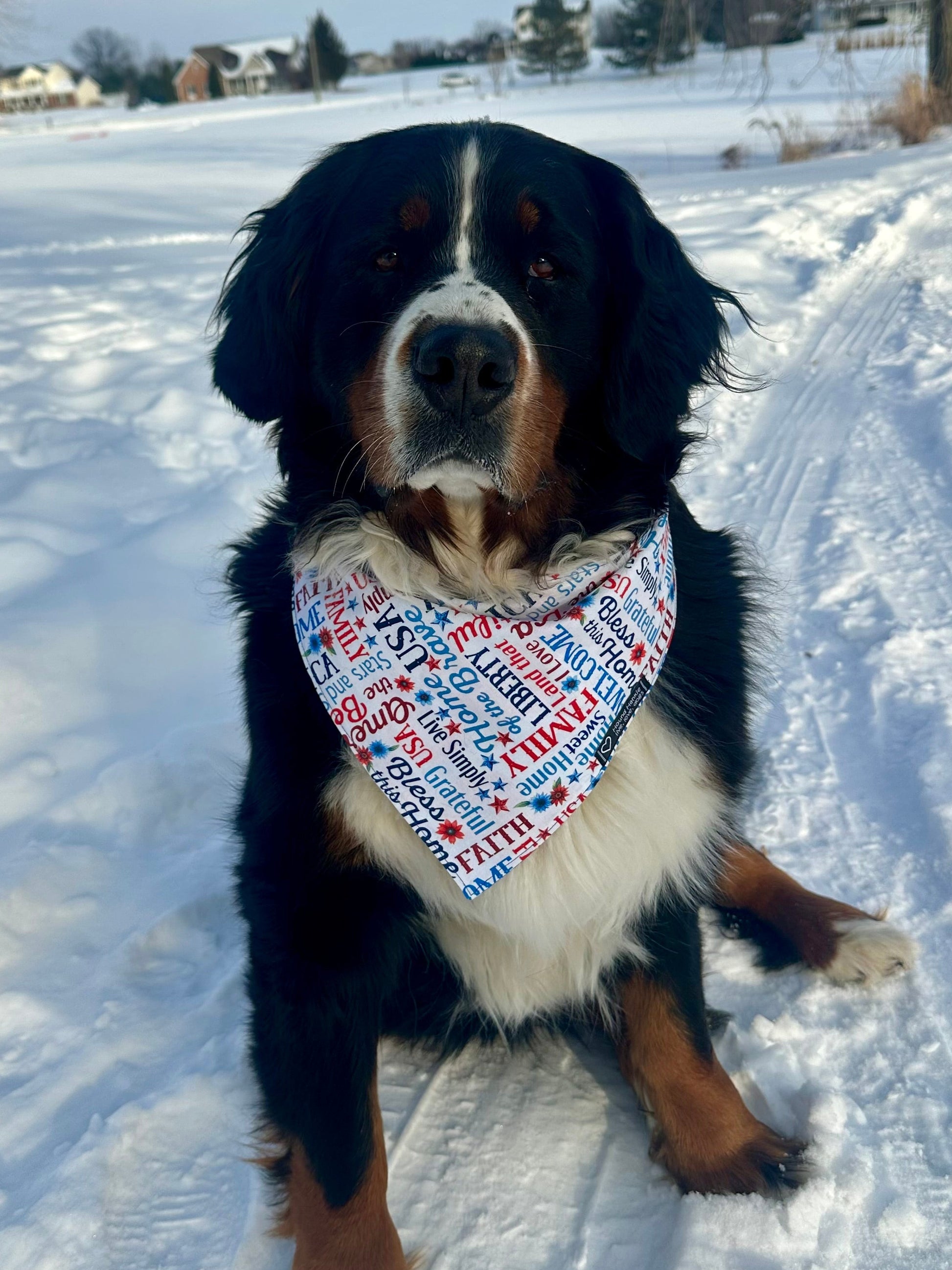 A red, white and blue floral print and red, white & blue patriotic words on the flipside- perfect for every summer day. The words are available with a white background or blue- your choice. Reversible means more bark for your buck! Top stitching increases durability and creates a polished finished edge. A curved neckline makes the hankie more comfortable (no bunching up of fabric); the labels are woven.