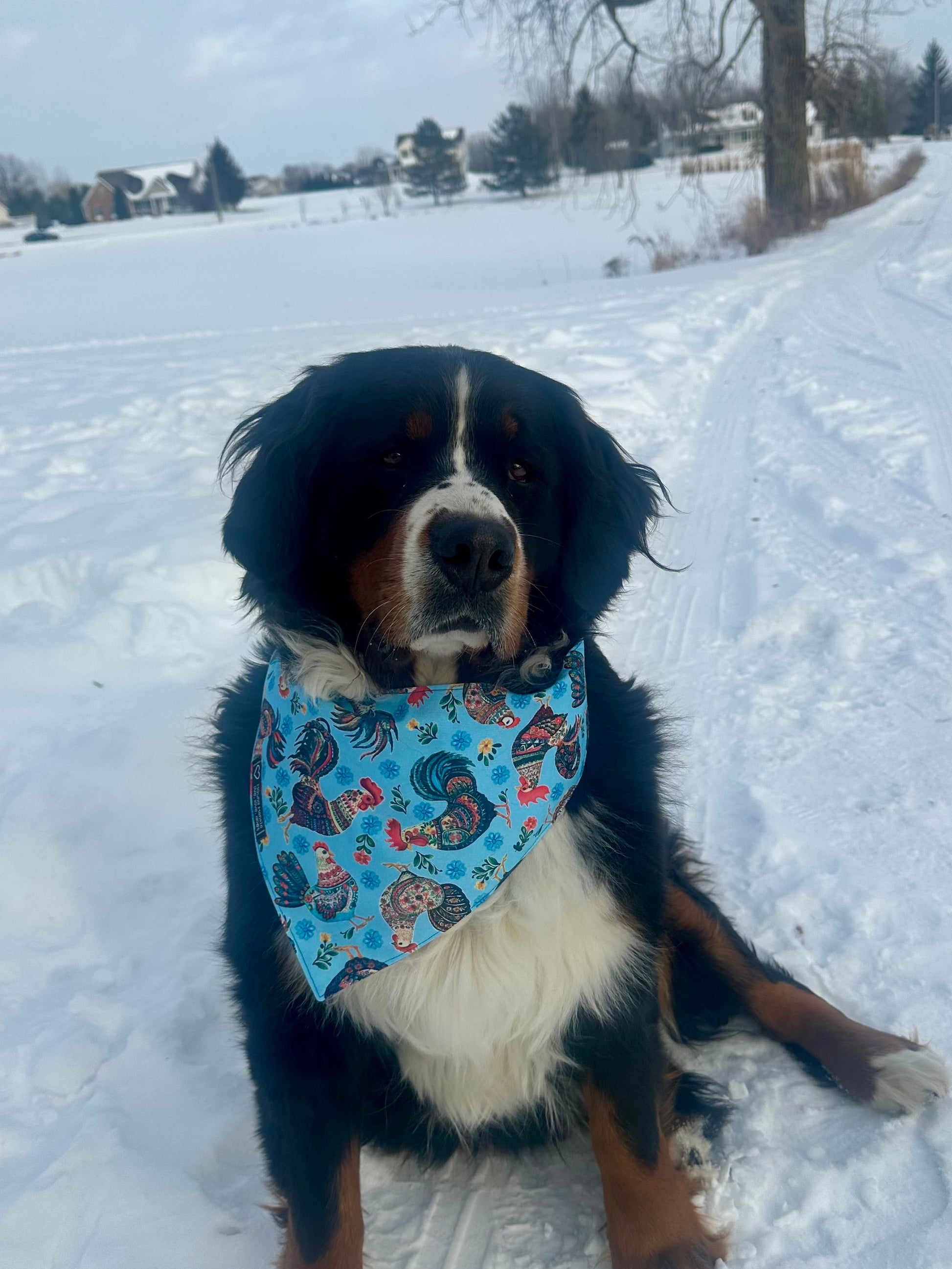 The rooster- a symbol of renewal, hope & the start of a new day. The flipside is a sunflower print repeating the blue/yellow color scheme; reversible means more bark for your buck.